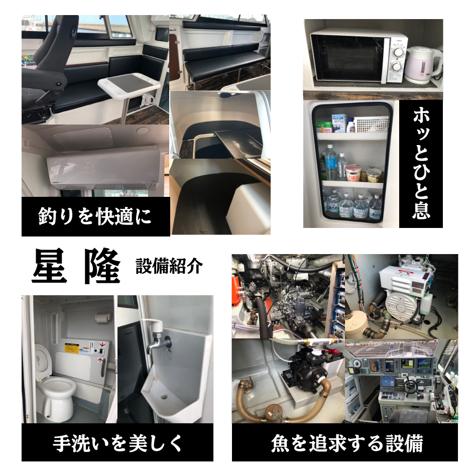 | 設備 | ブロードバンド魚探 ・D-GPS ×2 サーチライトソナー・サイドスラスター 発電補機、サテライトコンパス ・自動操舵 ・レーダー ・ ロッドホルダー・エアコン ・ベンチシート・ヒーター・ポット・電子レンジ他 現在改造中(*´∀`*) |